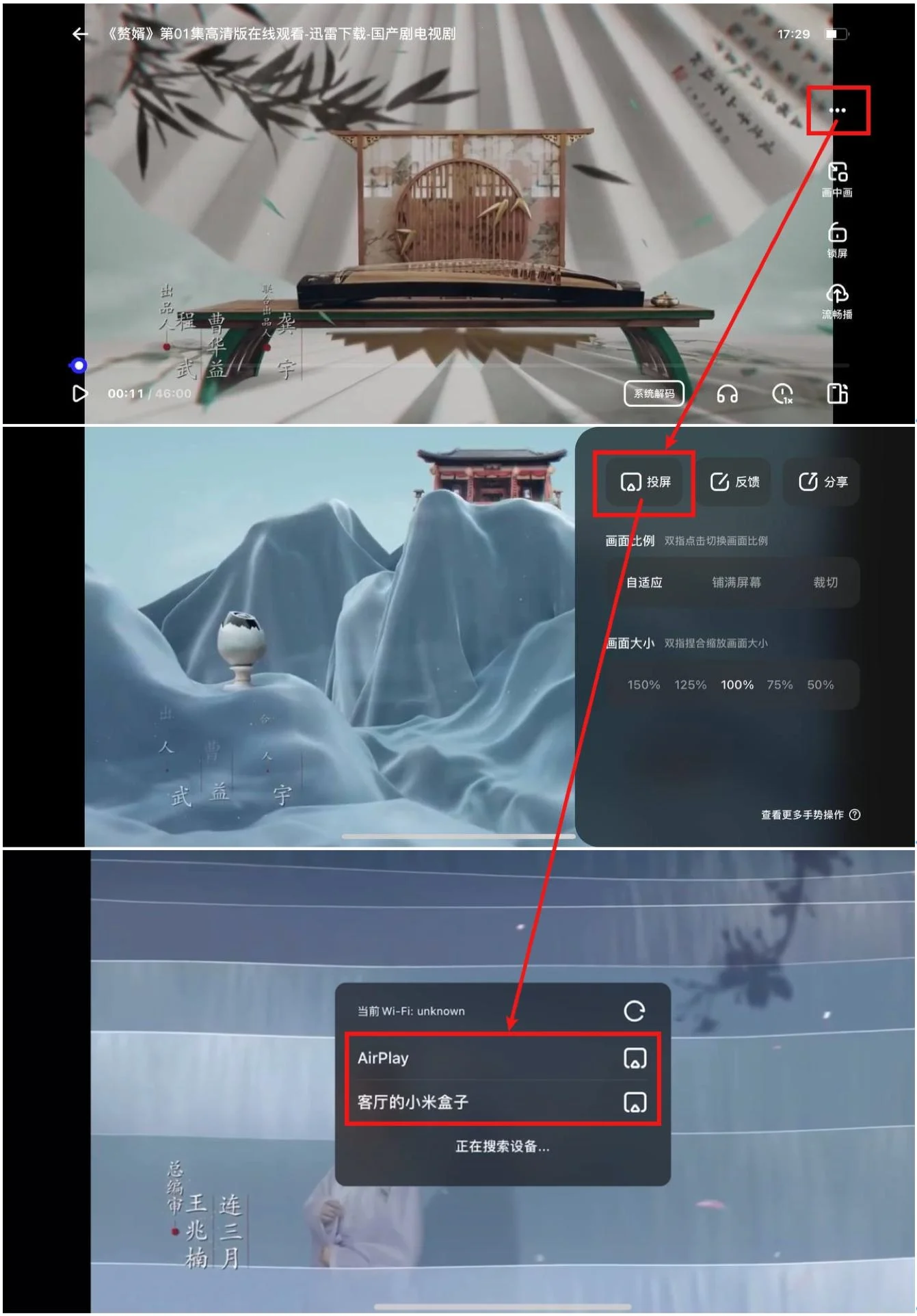 使用Safari浏览器,打开彗星视频->开始播放->全屏->左下角投屏->等待搜寻到智能电视/电视盒子->选中,即可投屏。