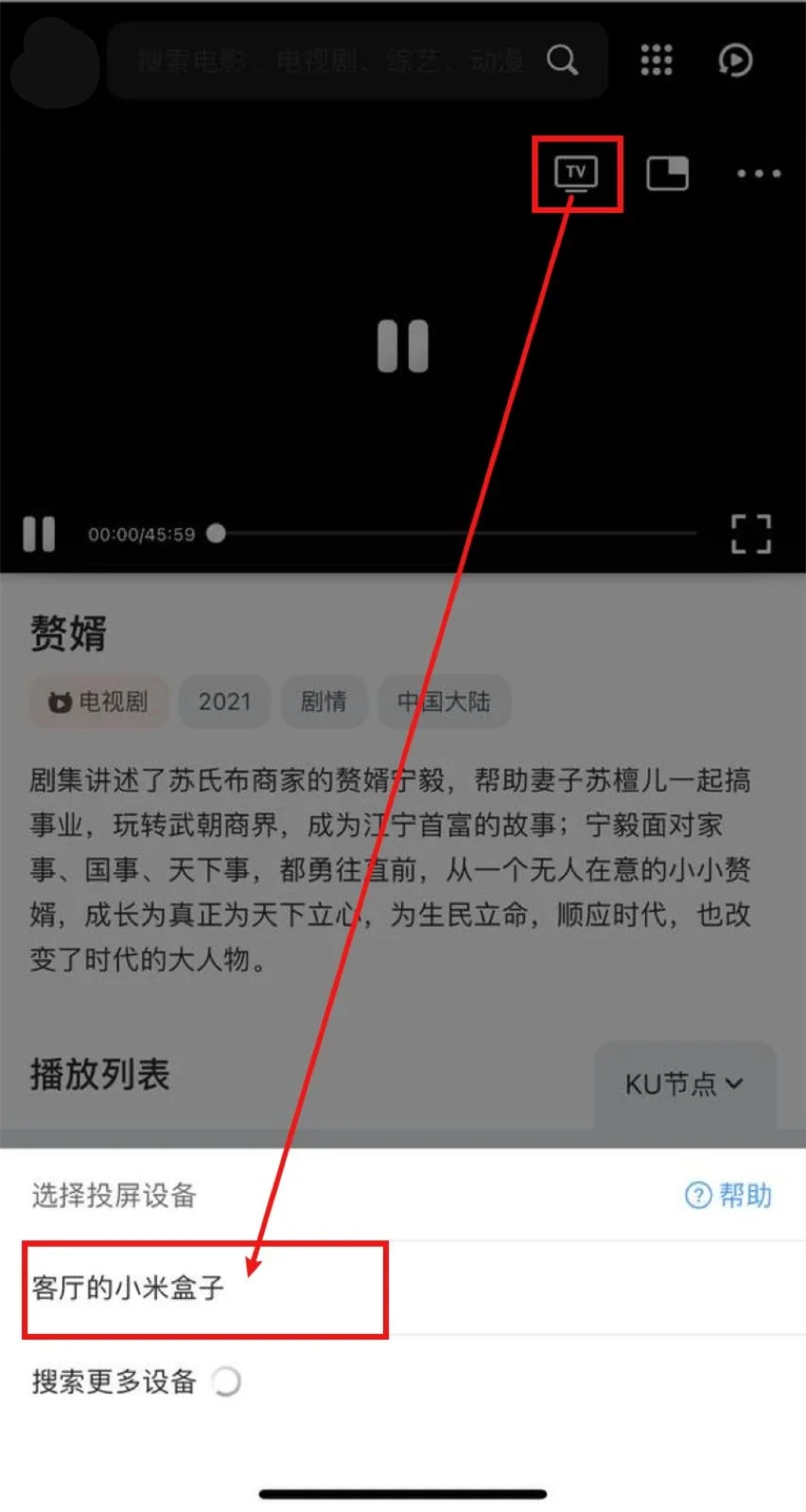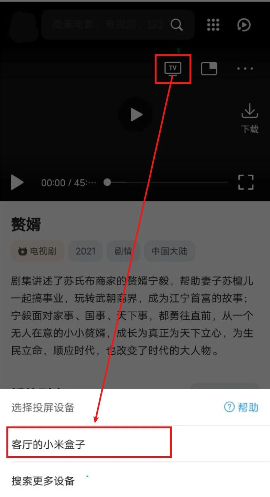 打开QQ浏览器(会接管网页播放器)->打开彗星视频->播放视频->选中投屏图标->等待搜寻出智能电视/电视盒子->选中,即可投屏。