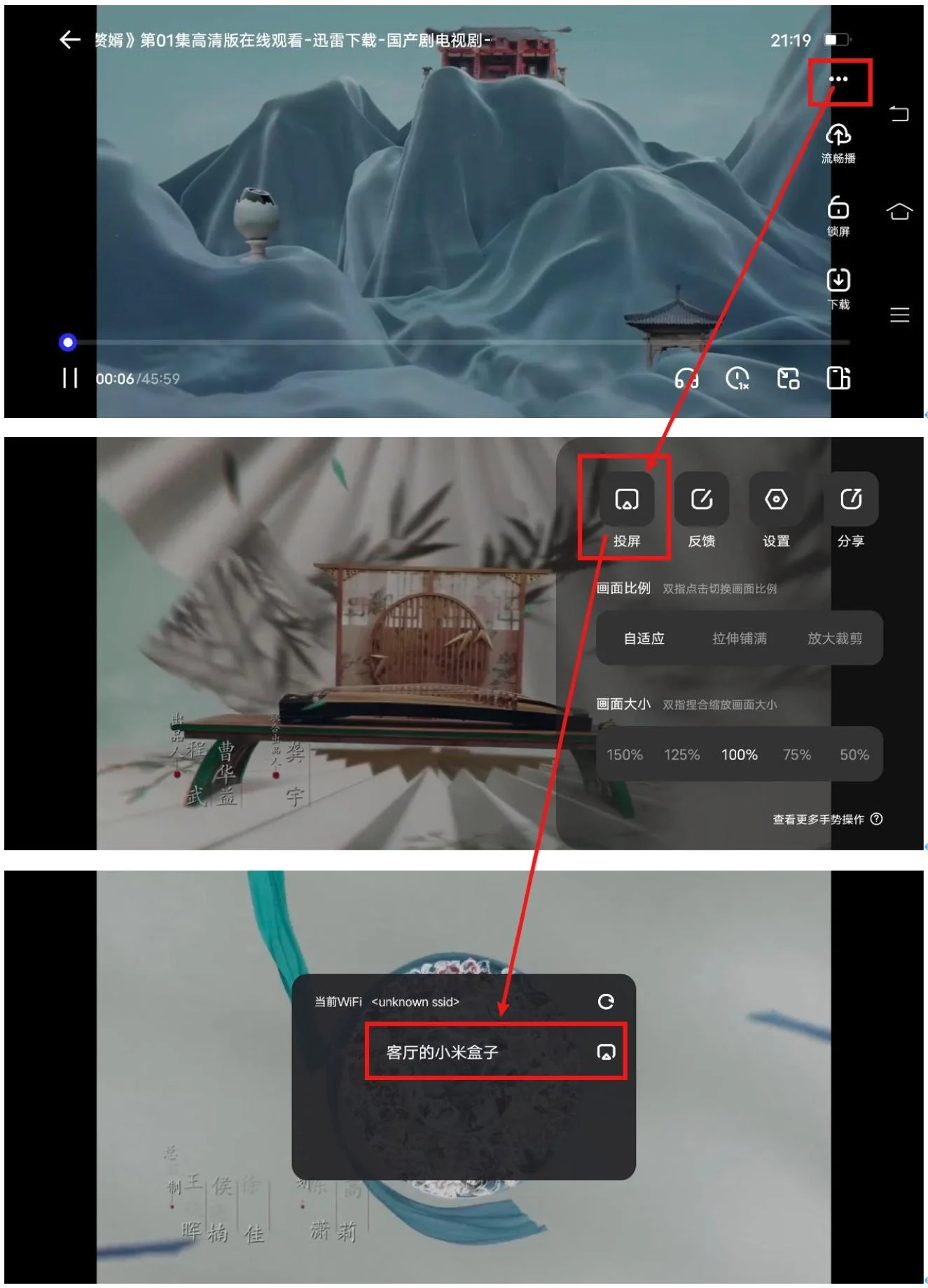 打开安卓UC浏览器->打开彗星视频->开始播放->全屏->左下角投屏->等待搜寻到智能电视/电视盒子->选中,即可投屏。